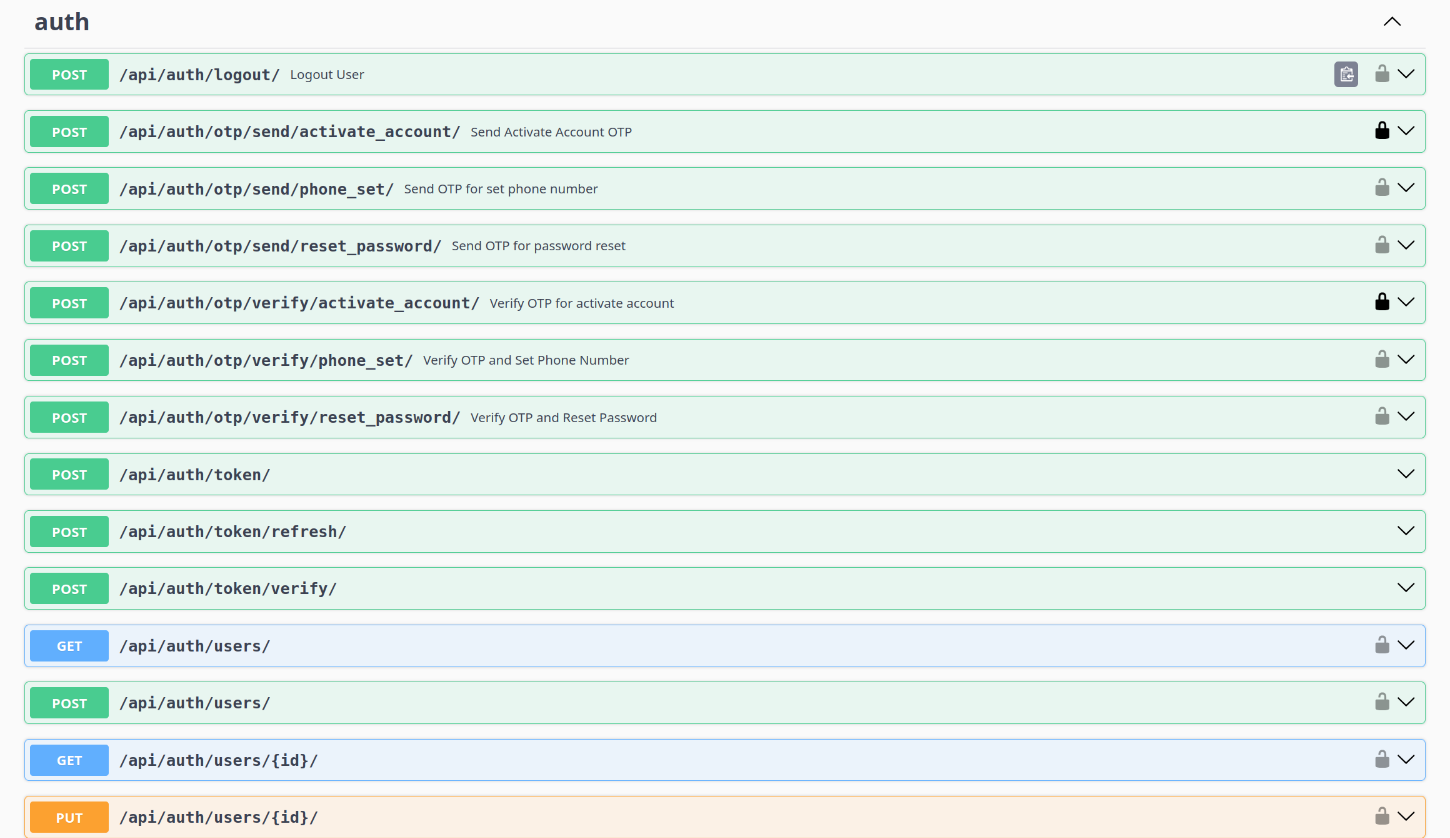 - Authentication & User Management: Custom user model with email login, profile management, JWT authentication, logout with token blacklist, and OTP-based activation, password reset, and phone verification.